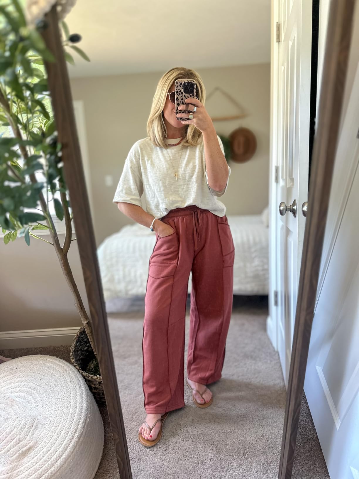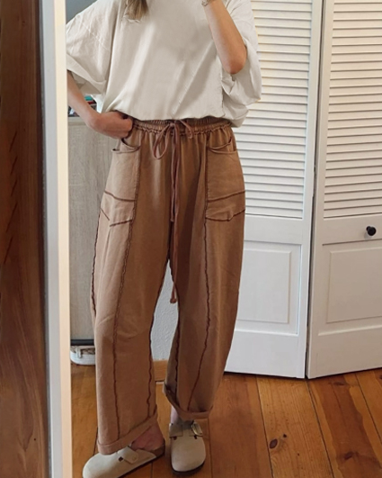 Cute pants, flattering style and great color. I sized up to a large for a more flowy fit. Material is terry inside so light weight & breathable. Pockets are so cute and functional. My only issue is that the stitching down one seam, they missed a spot so there was a hole in the pants. It was an easy fix, but hard to match thread color. I need more colors now! Rachel.
