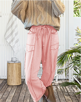 Feature: These wide-leg pants feature an elastic smocked waist with an adjustable drawcord, roomy patch pockets, and raw-cut exposed seams for an edgy yet functional vibe.